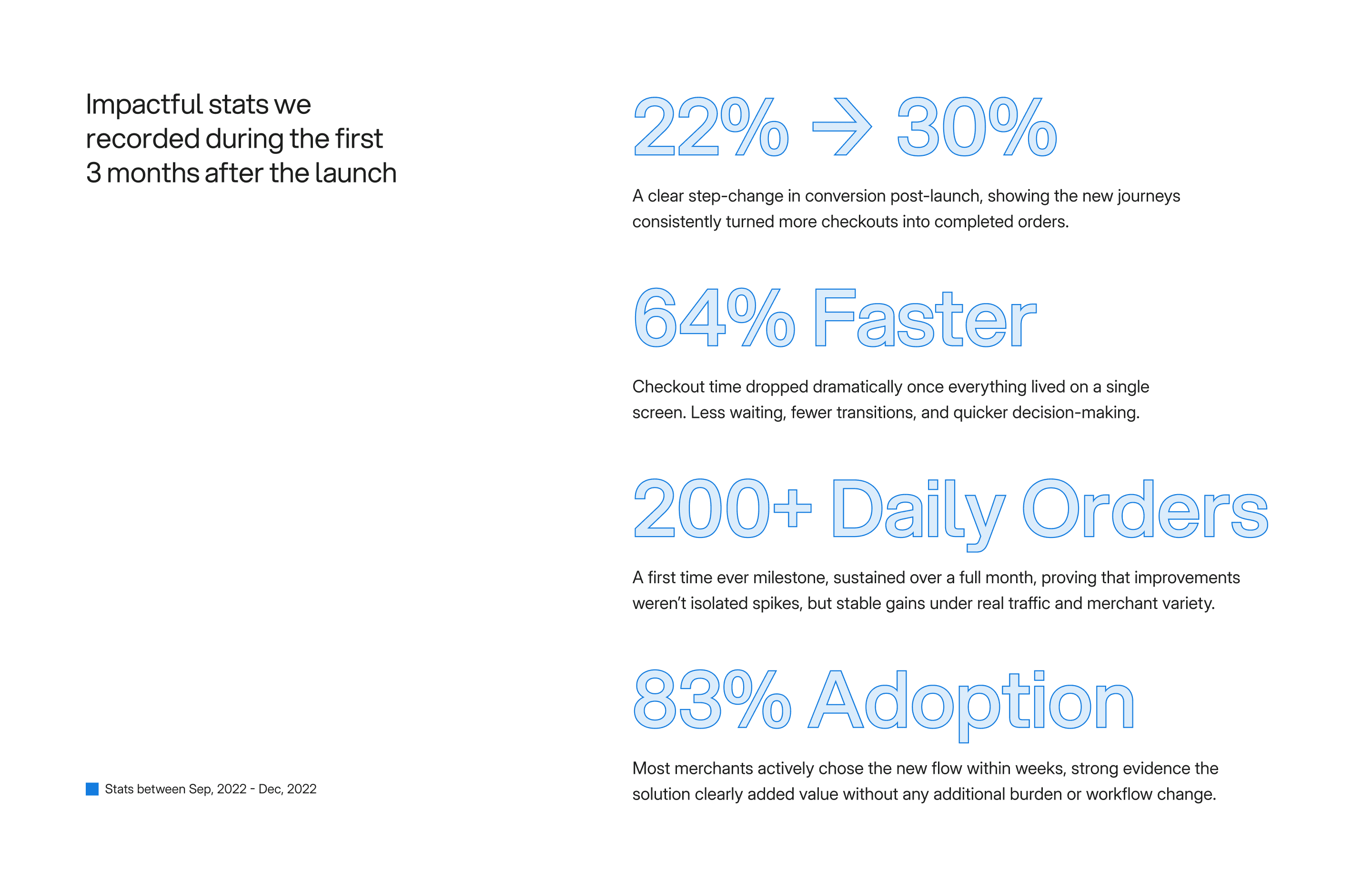 In the grand scheme, this wasn’t a design improvement. It was a foundational upgrade to one of the most business-critical moments in the product, delivered through tight collaboration across design, product, and engineering. What started as a persistent KPI risk turned into a measurable turnaround, and the combined effort over roughly half a year resulted in a checkout experience that was faster, clearer, and easier to adopt and manage for every stakeholder involved.